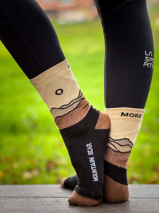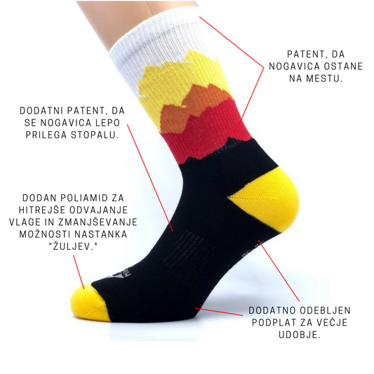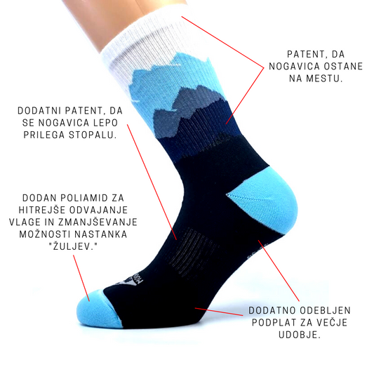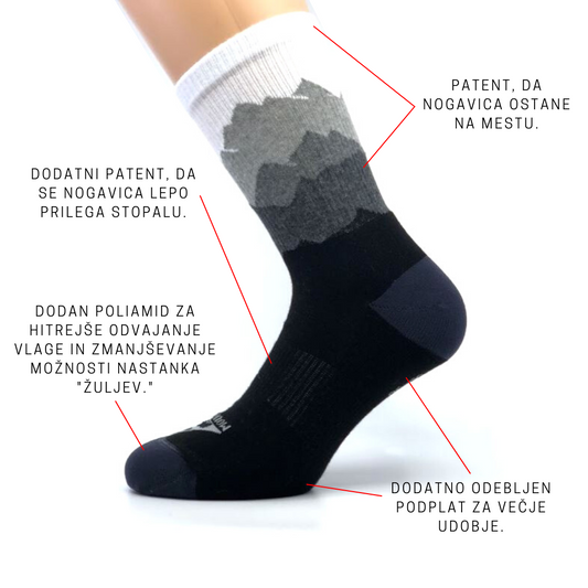 Preden obuješ svoje pohodne čevlje poskrbi, da bodo tvoja stopala obuta v KAKOVOSTNE in UDOBNE POHODNE NOGAVICE. Naše nogavice poskrbijo, da bo tvoja pot lahkotnejša in da te čevelj nikol ne ožuli, saj sov predelu prstov in pete okrepljena z dodatno plastjo materialov.